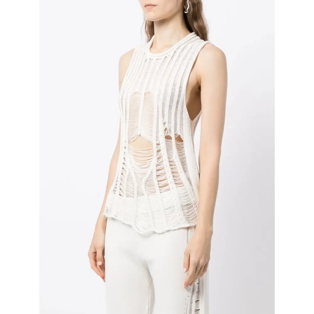 Ажурная вязка, эффект потертости, круглый вырез и без рукавов.