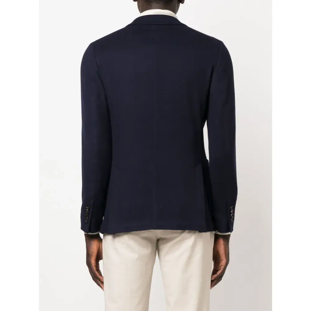 Темно-синий, шерсть, зазубренные лацканы, застежка на пуговицах спереди, прорезной карман на груди, два накладных кармана спереди, длинные рукава, манжеты на пуговицах, две боковые шлицы сзади и прямой подол.