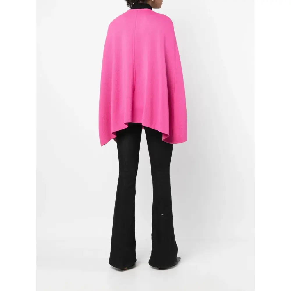 Фуксия, шерсть, бахрома, круглый вырез, длинные рукава и планка на пуговицах спереди.