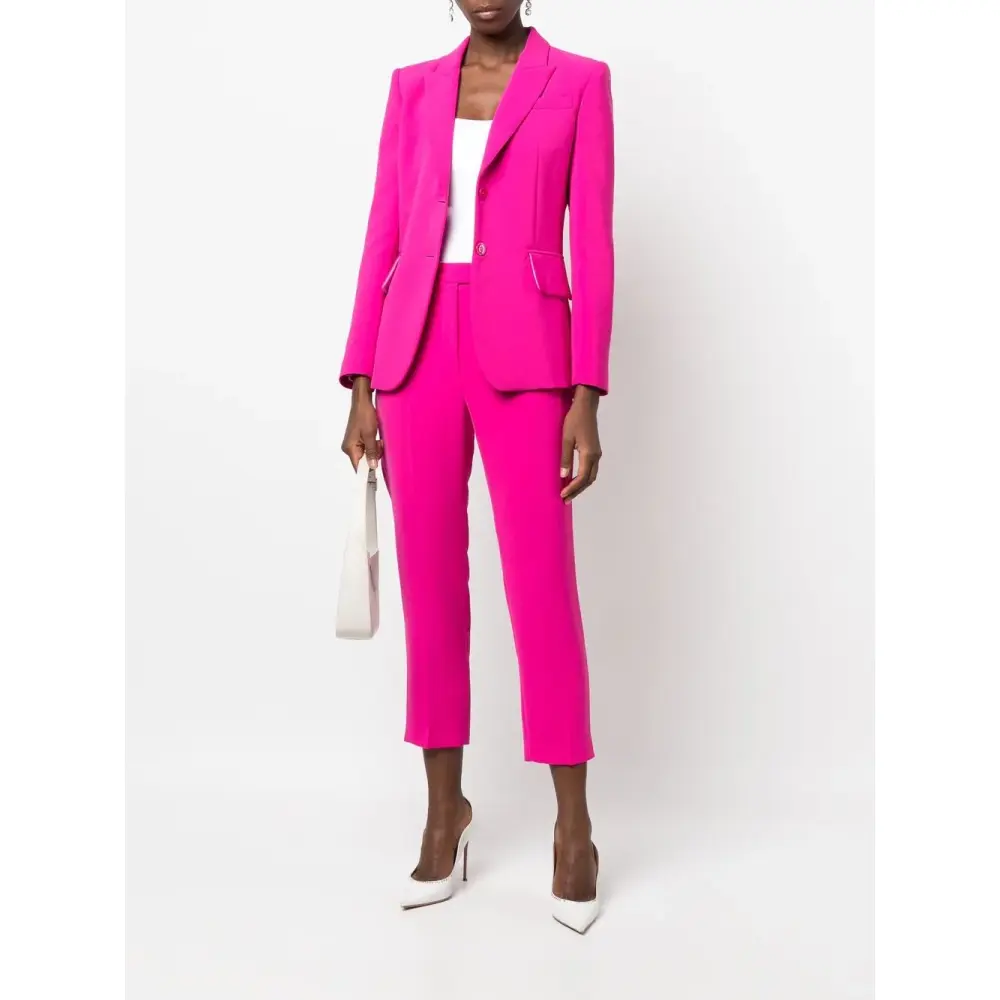Фуксия, завышенная талия, прямой крой, укороченная длина, потайная застежка спереди и прорезные карманы по бокам.