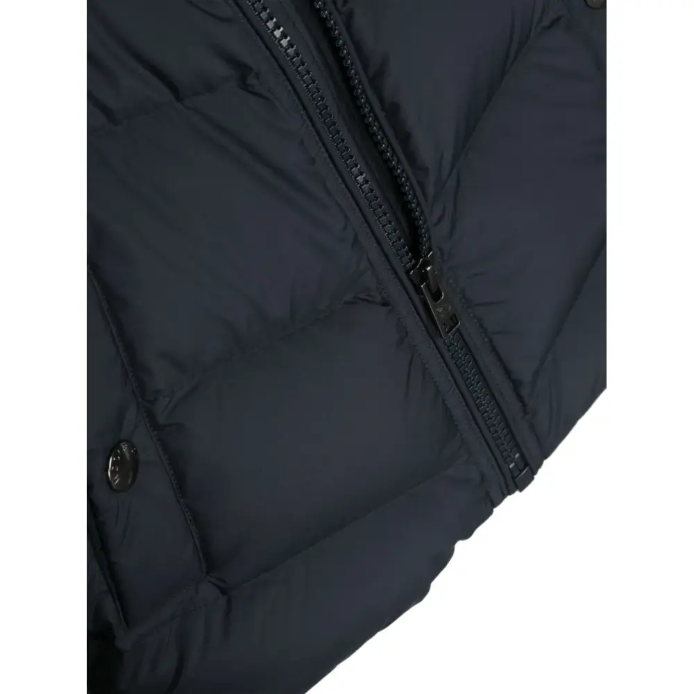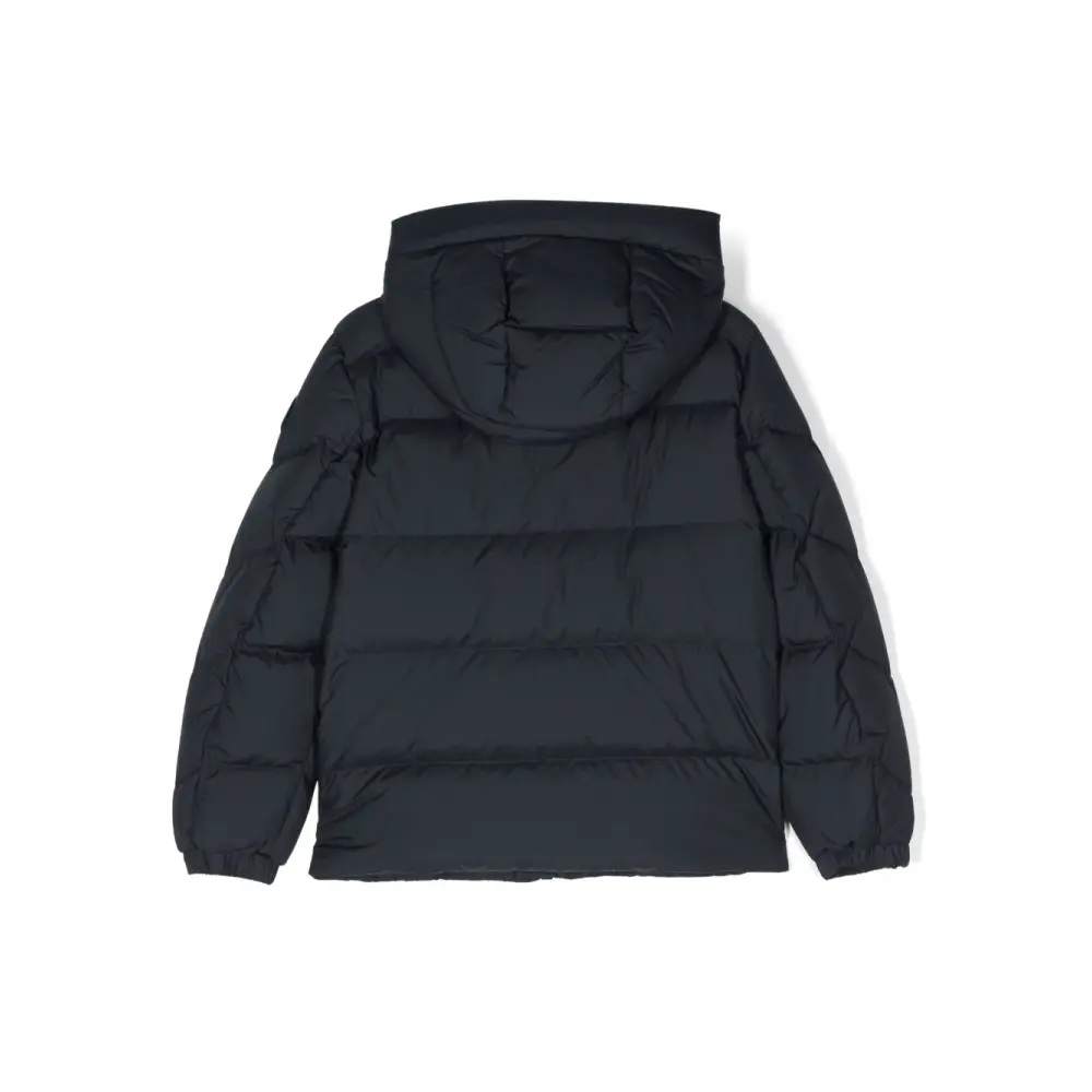 Темно-синий, утиный пух, дутый материал, нашивка с логотипом на рукаве, объемный капюшон, застежка на молнии спереди, длинные рукава, эластичные манжеты, два боковых кармана с застежкой на кнопки и цельная подкладка.