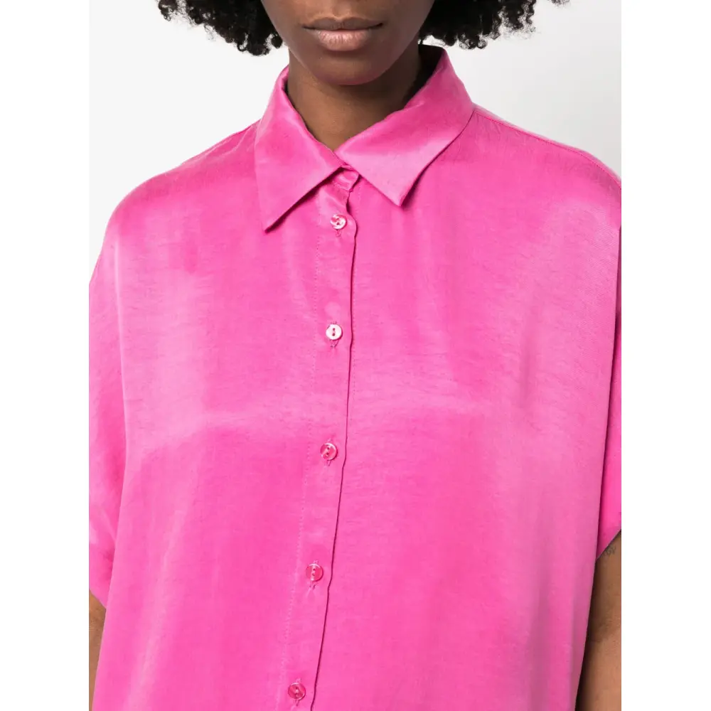 Фуксия, лакированное покрытие, оправа оверсайз, классический воротник, застежка на пуговицах спереди, приспущенные плечи, короткие рукава и прямой подол.