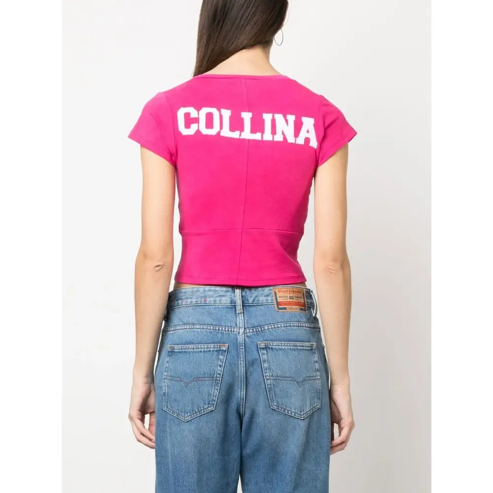 Темно-розовый, хлопок, принт с логотипом сзади, V-образный вырез, рукава кап и прямой подол. . Узнать больше о том, какие товары получают отметку «Ответственный выбор», можно из материала «Как мы оцениваем экологичность и этичность».