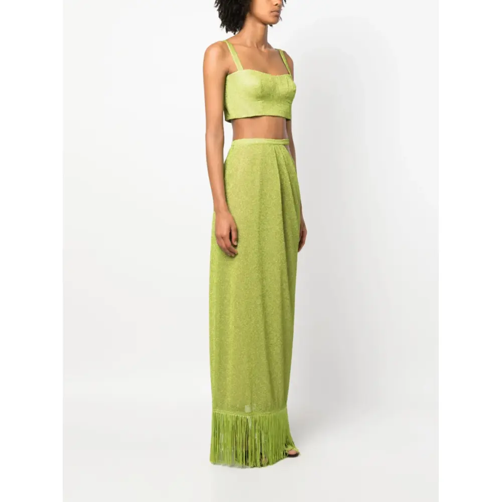 Зеленый, люрекс, формованная чашка, широкие бретели, вырез в форме сердца, укороченная длина, потайная застежка на молнии сзади, завышенная талия, вырезные детали, прямой крой, вырез сзади, края с бахромой и потайная застежка на молнии сбоку.