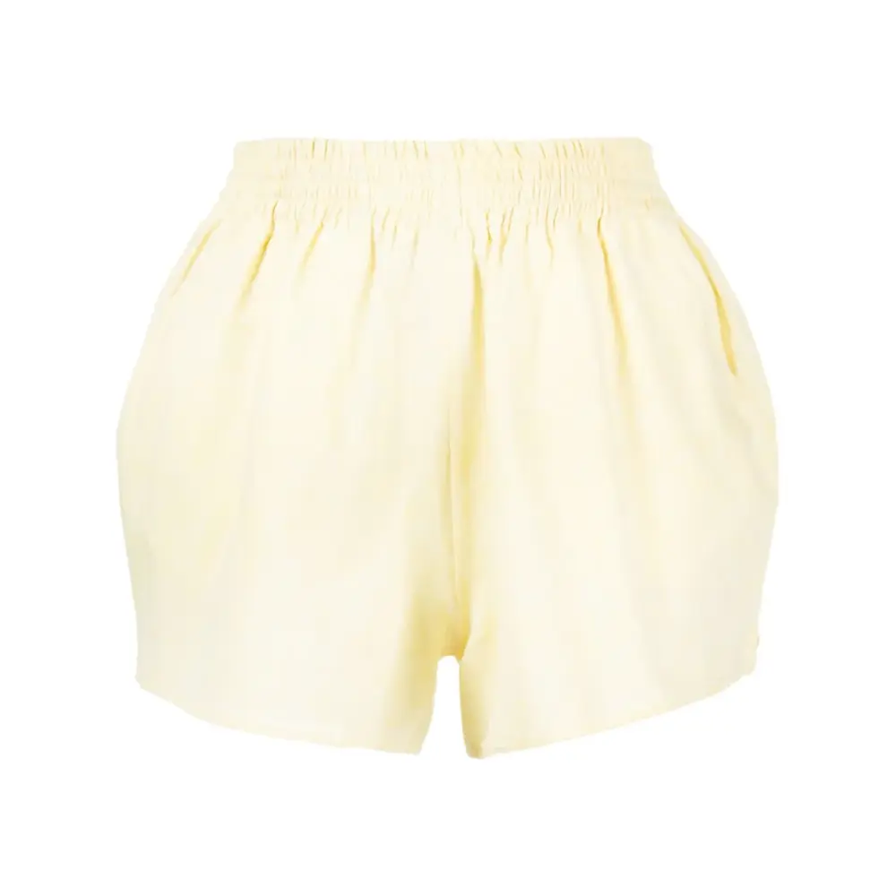 Светло-желтый, смесь хлопка и льна, складки, эластичный пояс, два накладных кармана сзади и длина до бедер. Этот товар как минимум на 50% состоит из материалов, которые признаны более безопасными для окружающей среды, и/или произведены с использованием методов, которые помогают сократить потребление воды и химических веществ. Узнать больше о том, какие товары получают отметку «Ответственный выбор», можно из материала «Как мы оцениваем экологичность и этичность».