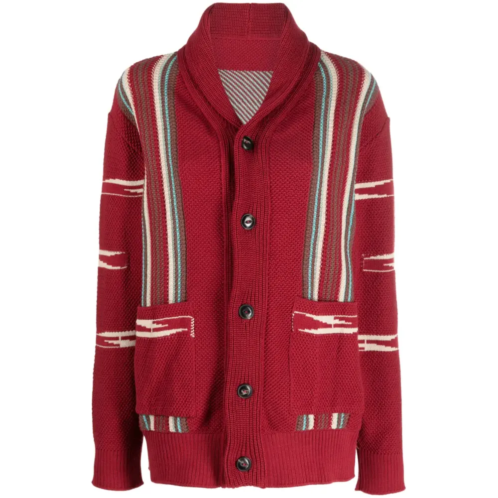 Бордовый, хлопок, вязка в технике интарсия, полоски, отложный воротник, застежка на пуговицах спереди, длинные рукава, два накладных кармана спереди и прямой подол.