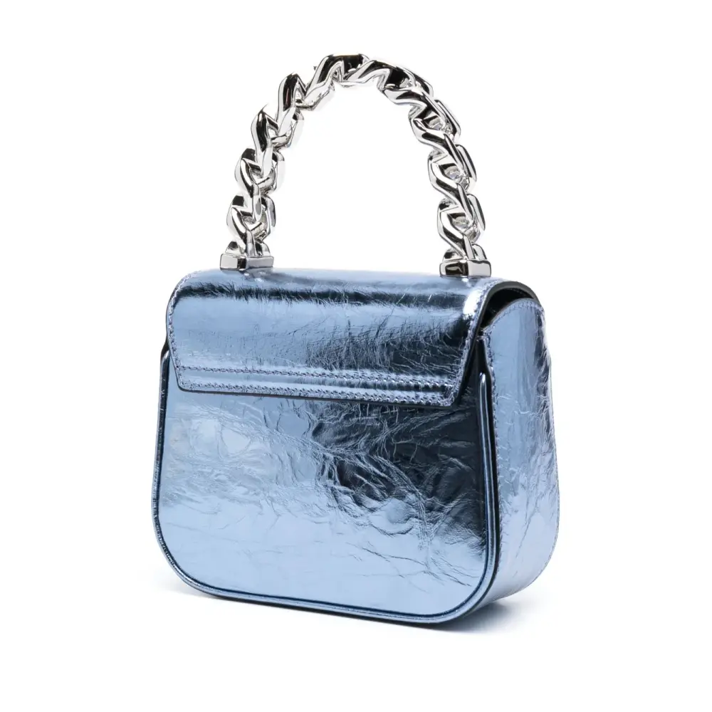 Синий, телячья кожа, эффект металлик, декор Medusa, серебристая фурнитура, откидной клапан, цепочный ремень, регулируемый ремень на плечо и основное отделение.