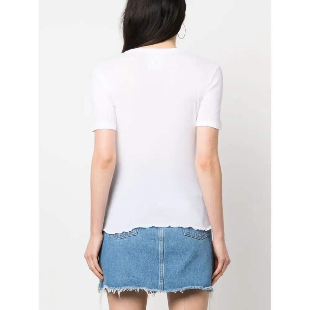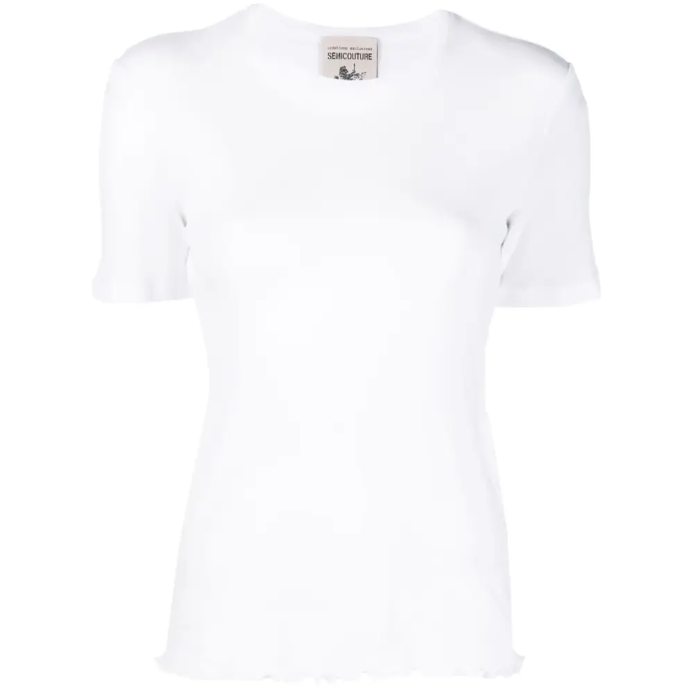 Белый, хлопок, круглый вырез, короткие рукава и волнистые края.