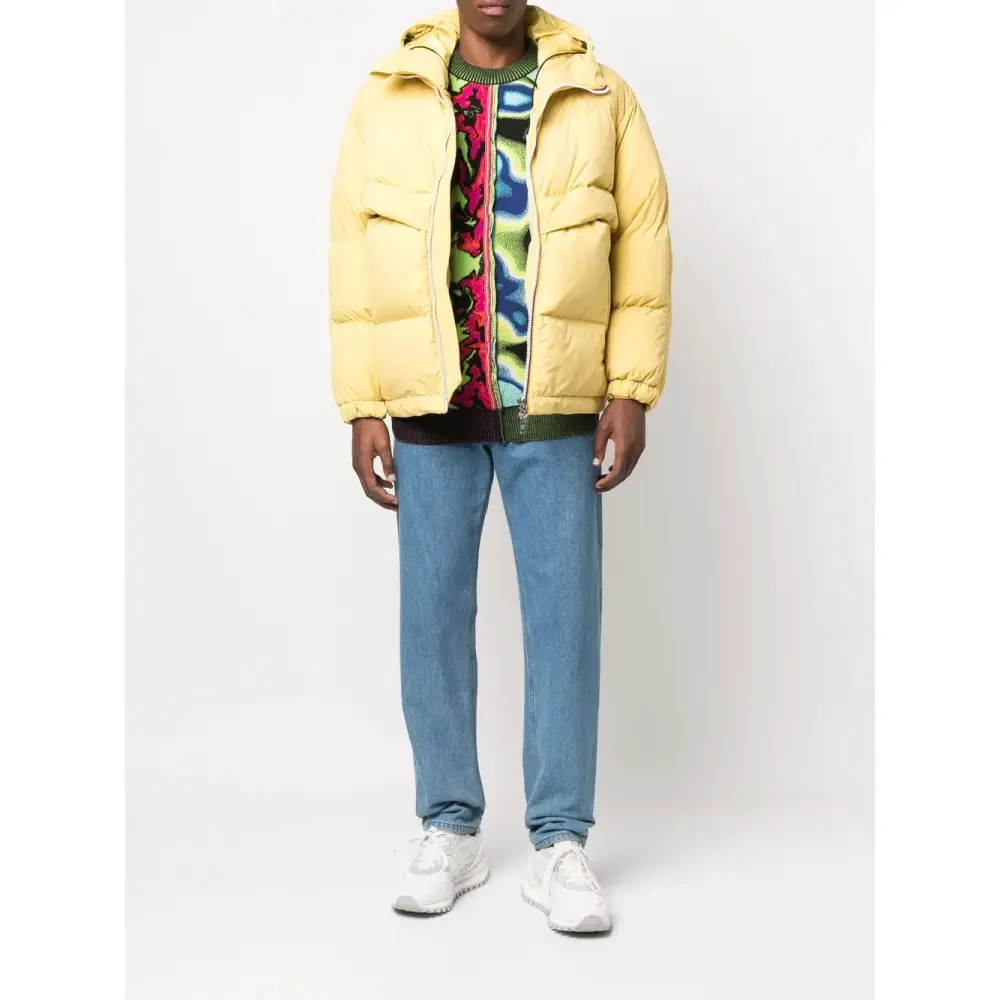 Лимонный, наполнитель из пуха и перьев, дутый материал, классический капюшон, застежка на молнии спереди, длинные рукава, эластичные манжеты и эластичный подол.