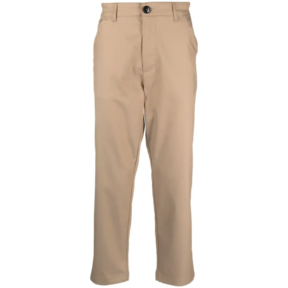 Расцветка Sesame Beige, смесовый хлопок, завышенная талия, петли для ремня, застежка на молнии и пуговице спереди, два кармана с клапанами сзади, прорезные карманы по бокам, зауженный крой и прямой подол.