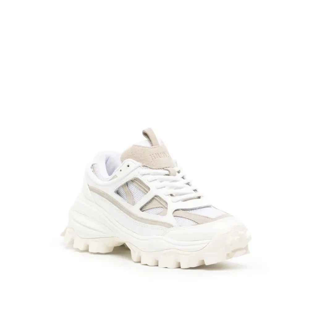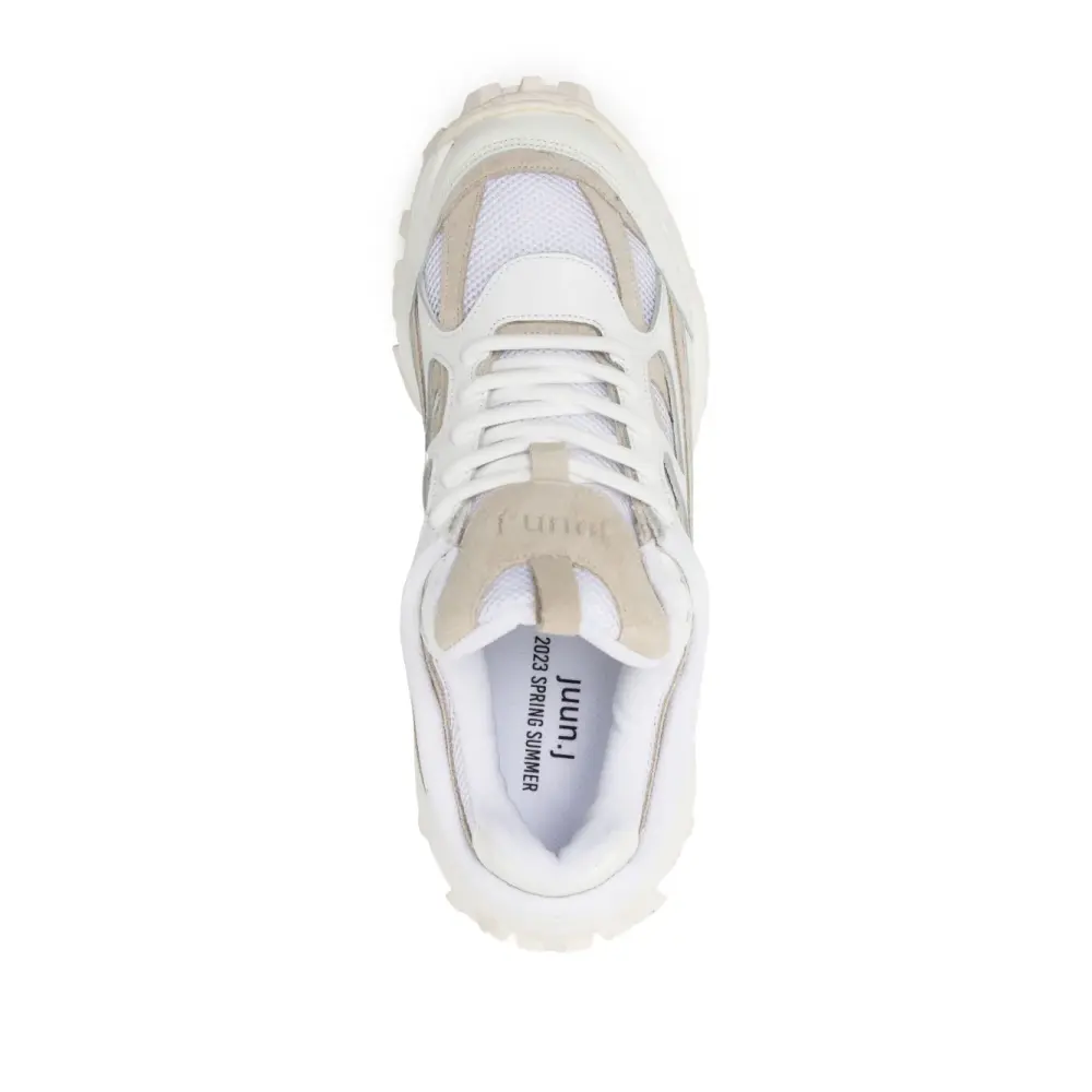 Белый, песочно-бежевый, тисненый логотип на язычке, петля для подтягивания на язычке, многослойная деталь, закругленный носок, шнуровка спереди, стелька с логотипом и массивная резиновая подошва.