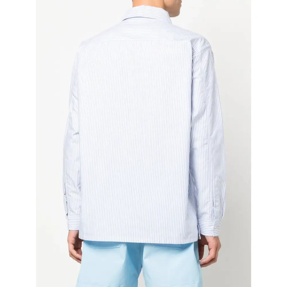Синий, белый, хлопок, узор в вертикальную полоску, нашивка с логотипом на груди, отложной воротник, застежка на пуговицах спереди, длинные рукава, манжеты на пуговицах, прямой подол и нагрудный накладной карман.