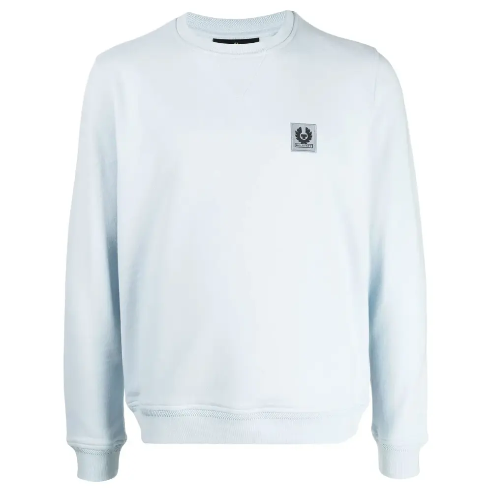 Голубой, смесовый хлопок, круглый вырез, нашивка с логотипом на груди, длинные рукава и прямой подол.