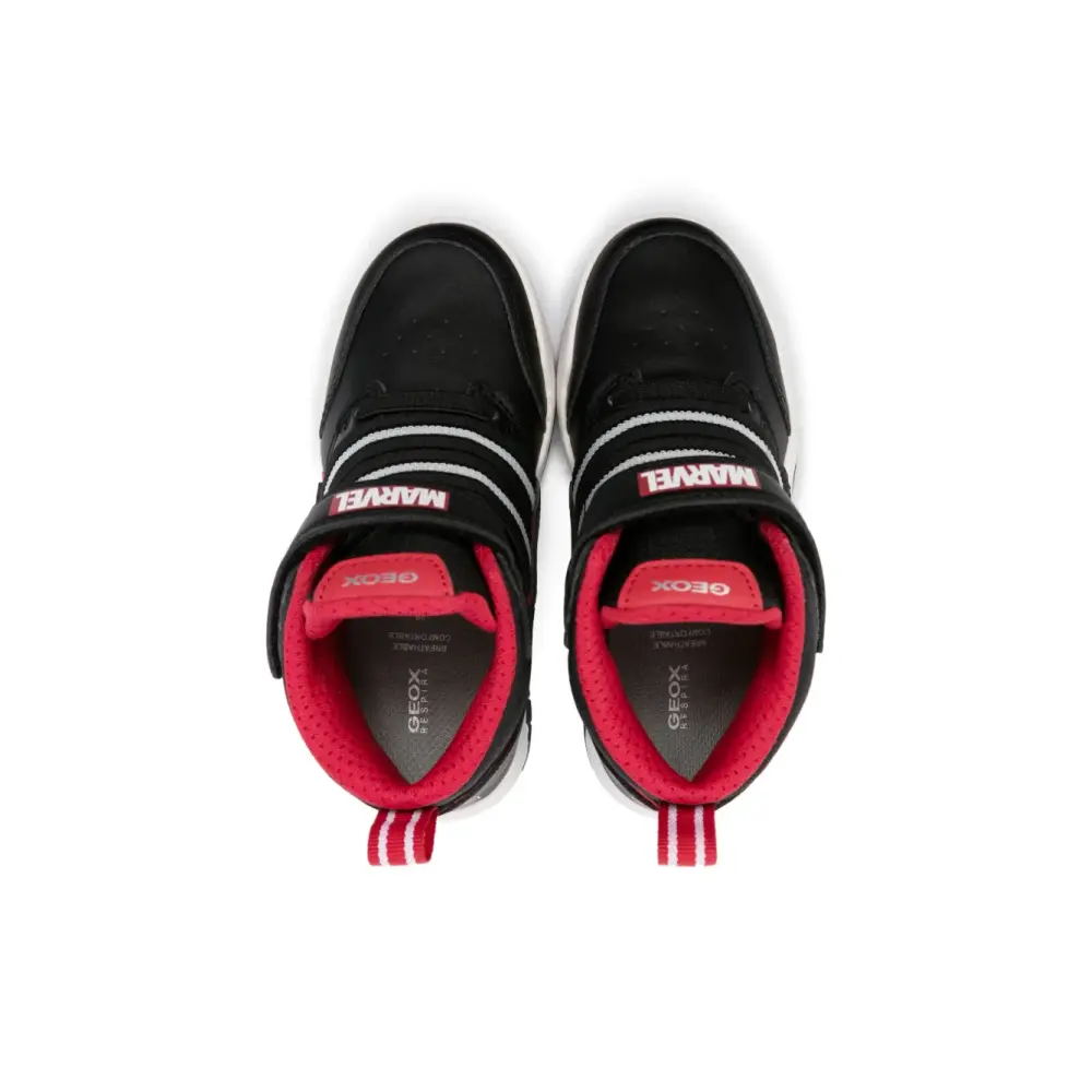 Черный/белый, ярко-красный, вставки, нашивка, язычок с логотипом, полоски, стелька с логотипом, перфорированный носок, закругленный носок, шнуровка спереди, застежка на липучке спереди, высота по щиколотку, петля для подтягивания сзади и плоская резиновая подошва.