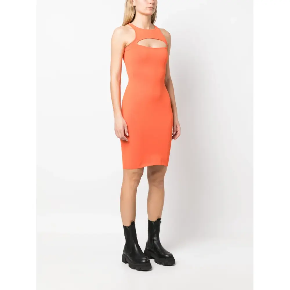 Темно-оранжевый, вырезные детали, серебристый металлический логотип, без рукавов, вырез рейсер, круглый вырез, прямой подол и длина выше колена.