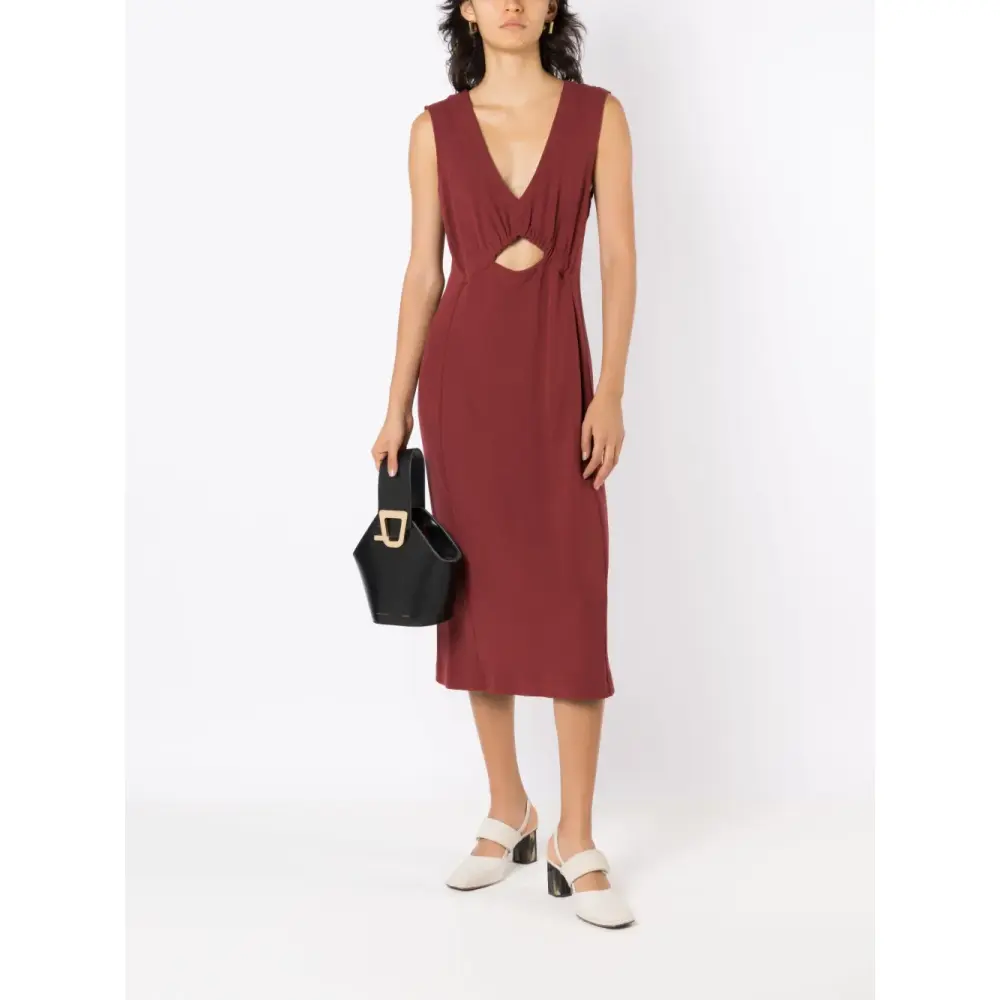 Красный, вырезные детали, V-образный вырез, без рукавов и длина ниже колена.