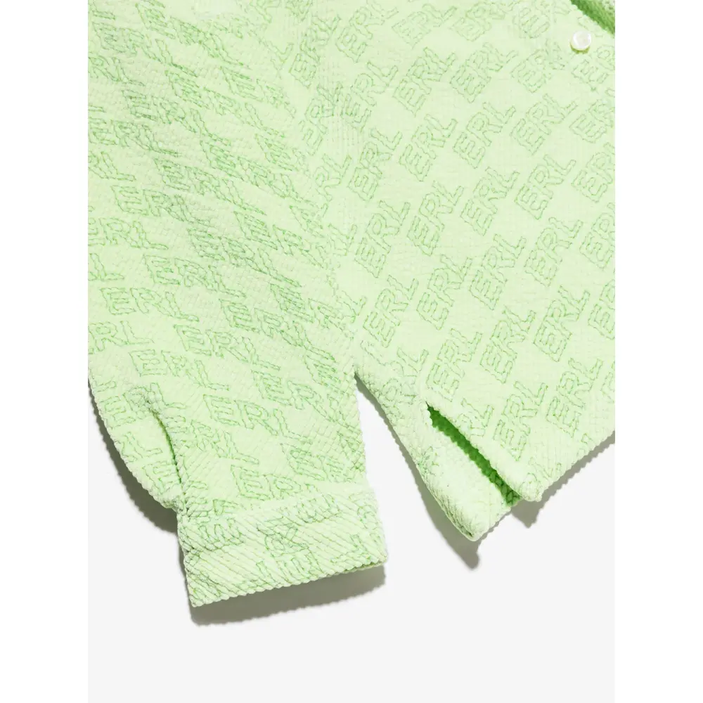 Светло-зеленый, ярко-зеленый, эластичный хлопок, вельветовый материал, сплошной принт с логотипом, классический воротник, застежка на пуговицах спереди, длинные рукава и прямой подол.