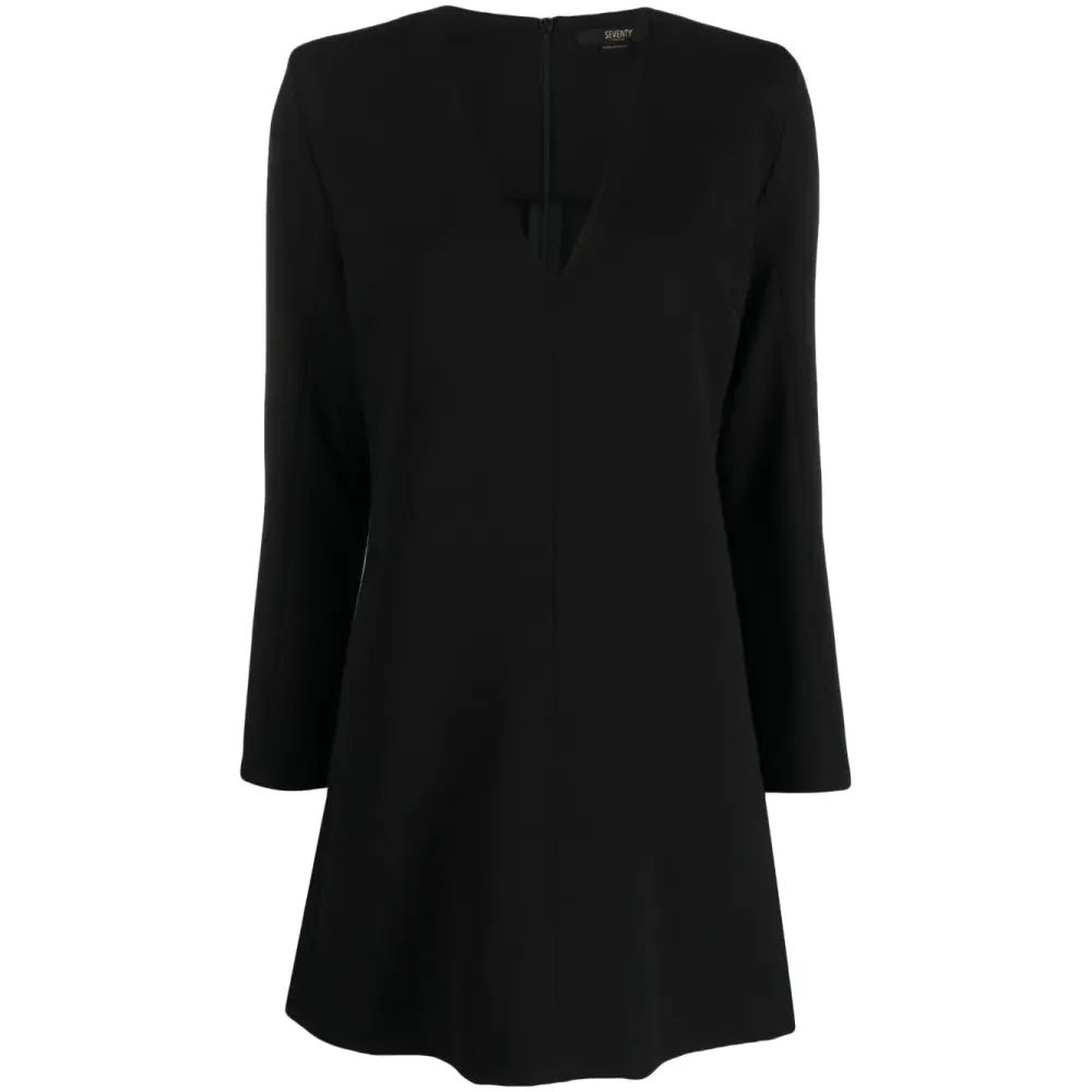 Черный, эластичный материал, защипы, V-образный вырез, застежка на молнии сзади, длинные рукава и прямой подол.