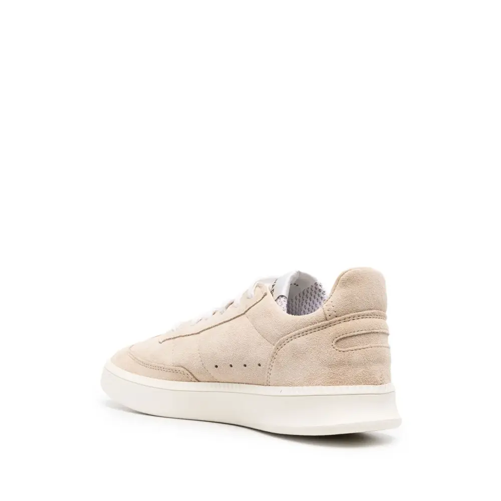 Бежевый, кожа, замша, нашивка с логотипом на язычке, закругленный носок, шнуровка спереди и плоская подошва.