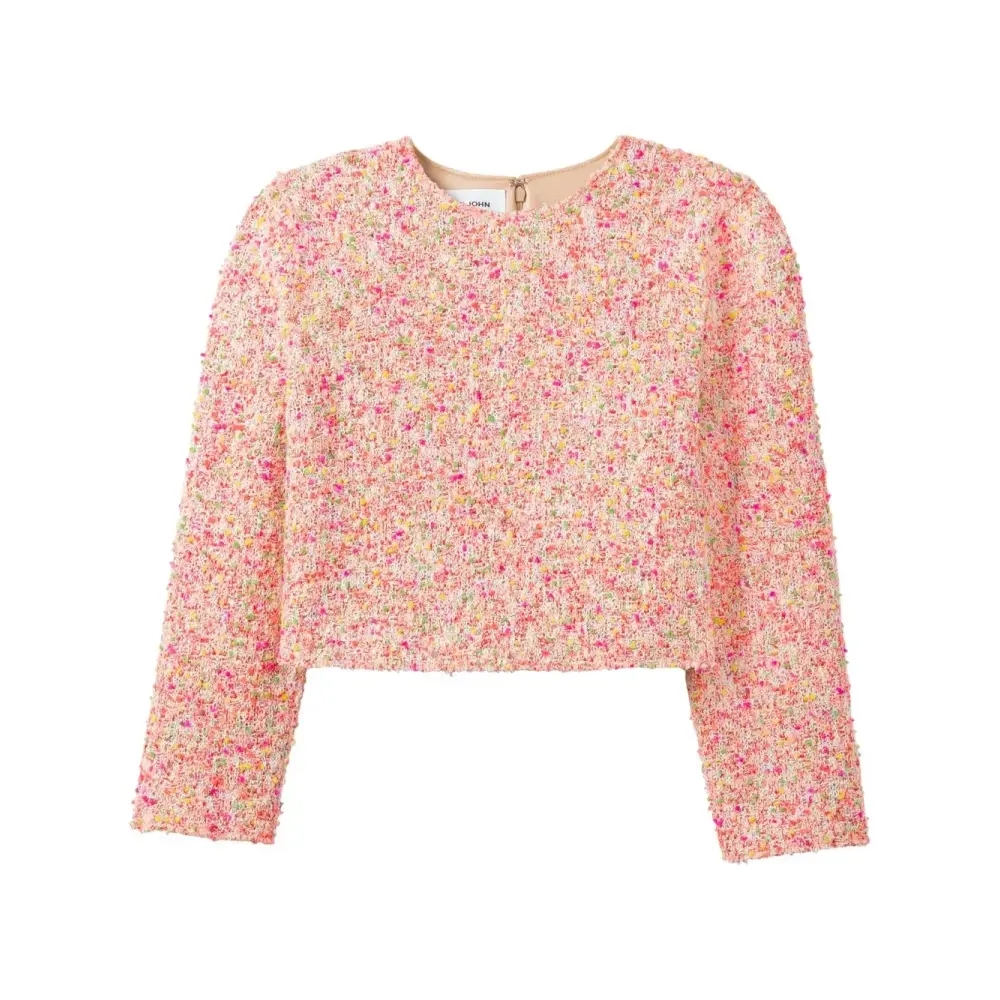 Светло-оранжевый, смесовый хлопок, твидовая ткань, круглый вырез, застежка на молнии сзади, рукава три четверти и прямой подол.