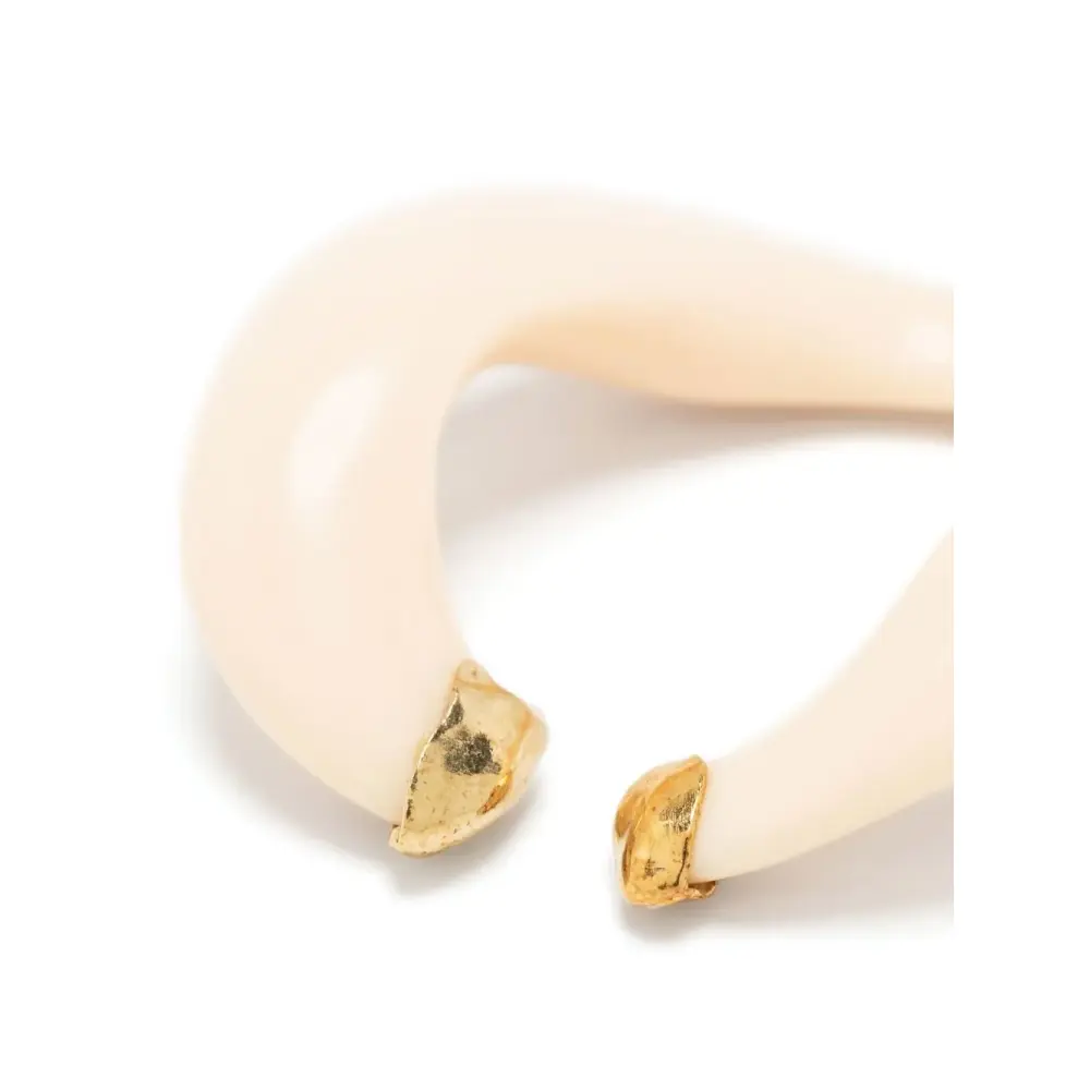 Цвет слоновой кости, золотистая фурнитура, кольца скульптурной формы и модель без застежки. В комплект входит одна серьга.