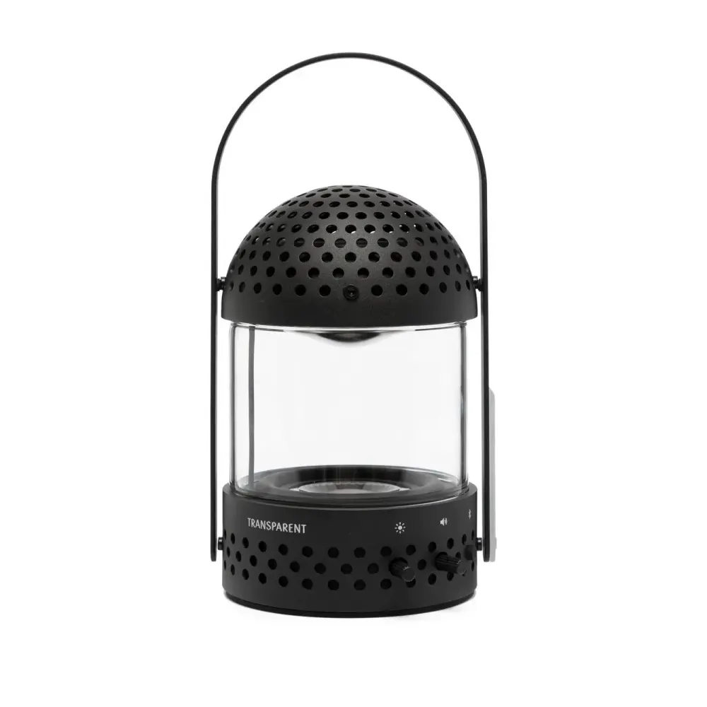 Черный, прозрачный материал, верхняя ручка и всенаправленный звук (360-degree sound).