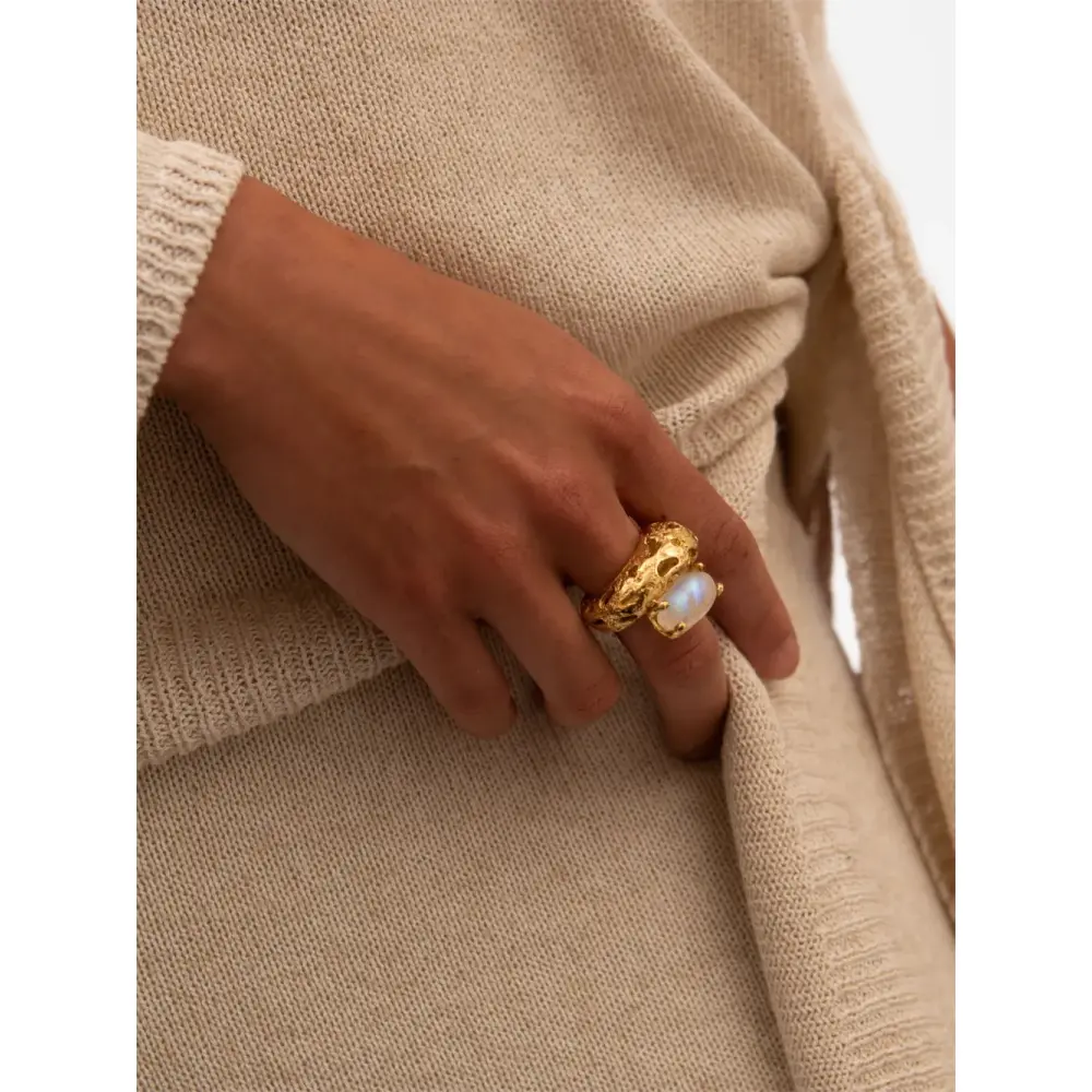 Покрытие из 18-каратного золота, лунный камень, фактурная отделка, перфорация, массивное кольцо и открытая спина.