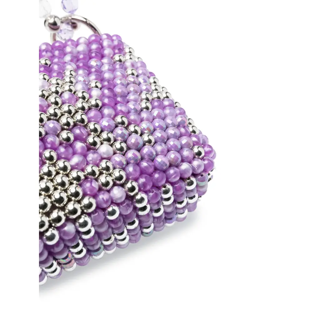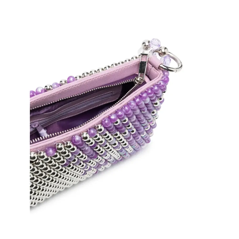 Сочетание двух оттенков, декор из бисера, застежка на молнии сверху, внутренний карман на молнии и ремешок-цепочка на плечо.