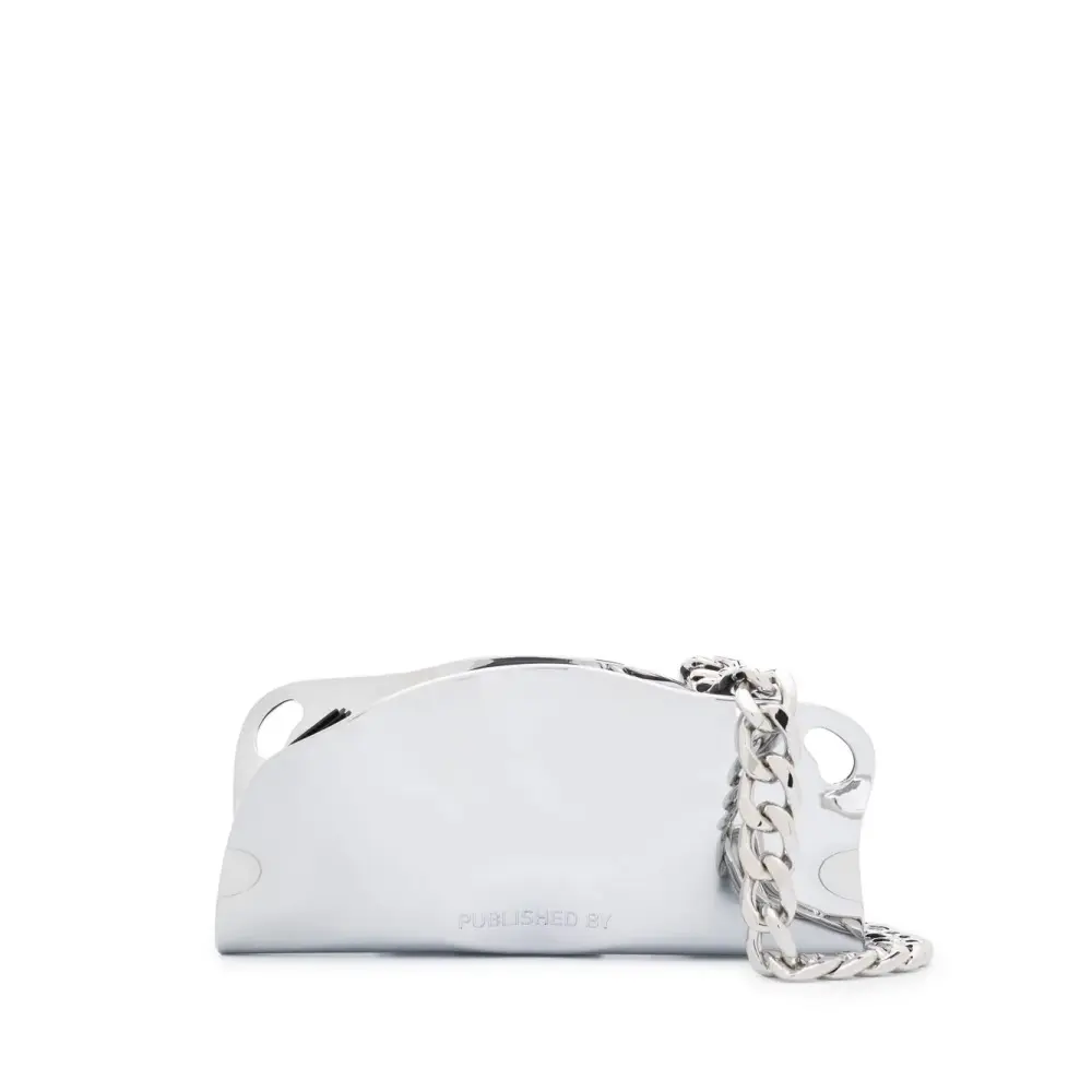Серебристый, кожа, покрытие с эффектом металлик, застежка на молнии сверху, основное отделение и ремешок-цепочка на плечо.