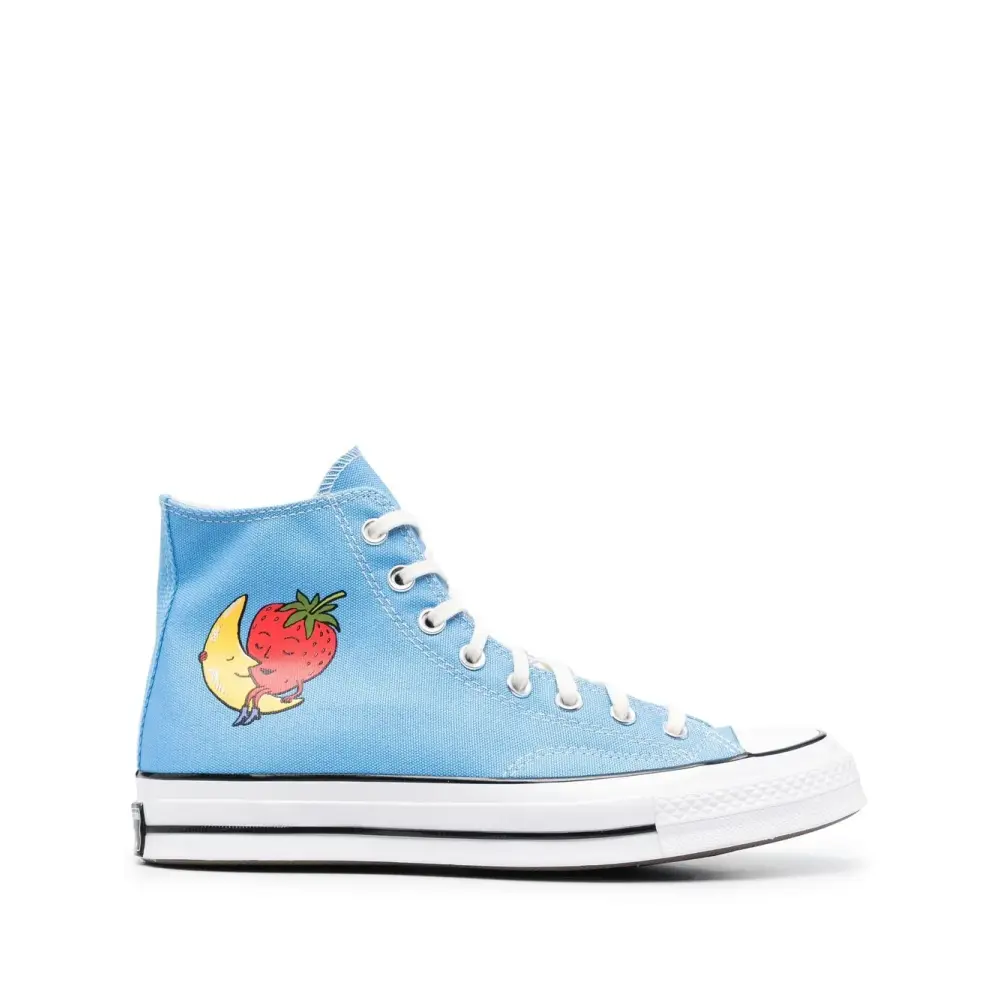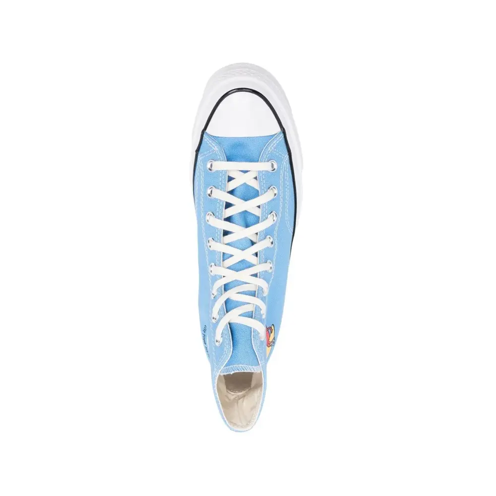 Голубой, хлопок, парусина, логотип сбоку, отделка металлическими люверсами, резиновый носок, высота по щиколотку, шнуровка спереди и плоская резиновая подошва.