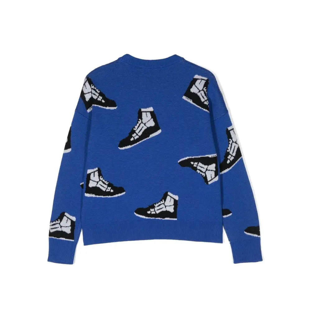 Синий, черный/белый, шерсть, сплошной графичный принт, трикотажный материал, круглый вырез и длинные рукава.