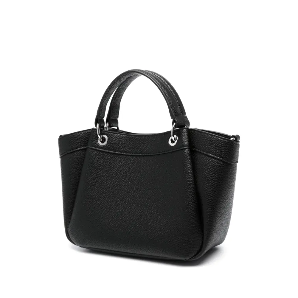 Черный, зернистая текстура, тисненый логотип спереди, ремешки с логотипом, две верхние ручки, съемный регулируемый ремень на плечо, магнитная застежка, основное отделение, внутренняя бирка с логотипом и внутренний прорезной карман.