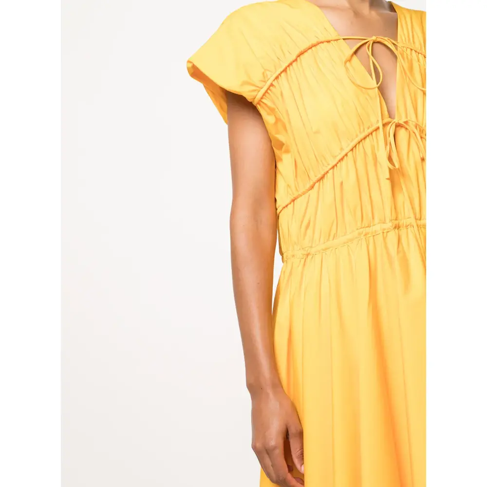 Расклешенный крой, V-образный вырез, завязки спереди, без рукавов и длина миди. Цвет: желтый.