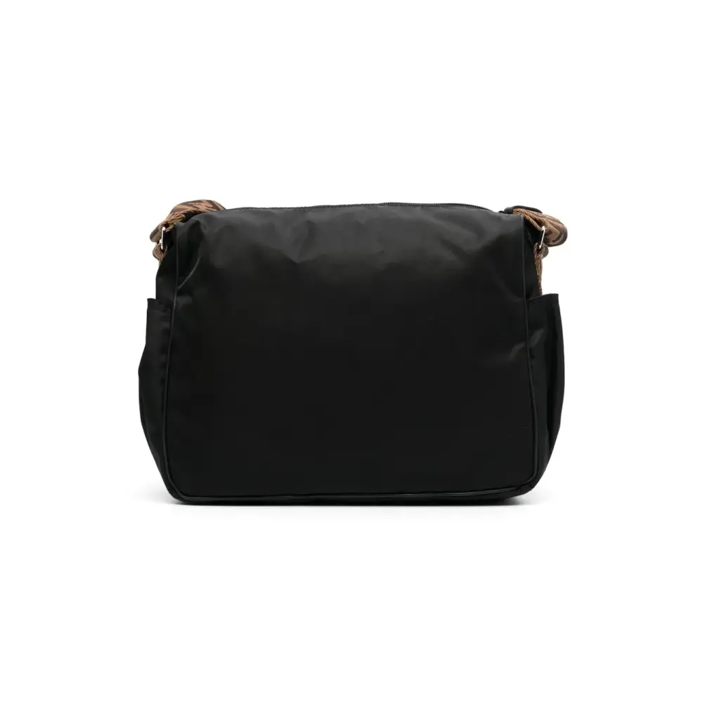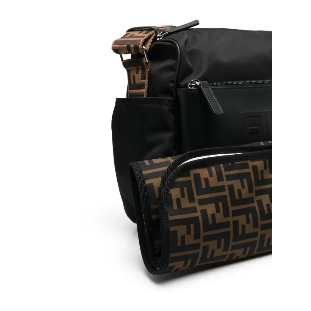 Черный, коричневый, переработанный нейлон, тисненый логотип спереди, логотип FF, ремень на плечо с логотипом, коврик для пеленания, карман на молнии спереди, два накладных кармана по бокам, застежка на молнии сверху и основное отделение. Ответственный выбор: Этот товар как минимум на 50% состоит из переработанных или повторно использованных материалов.