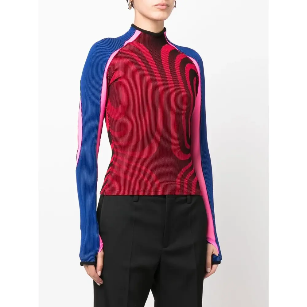 Черный/разноцветный, дизайн колор-блок, ткань в мелкий рубчик, высокий воротник, длинные рукава и прямой подол.