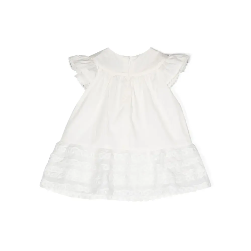 Кремово-белый, хлопок, вышитый логотип на груди, вышивка на подоле, вышитые края, круглый вырез, короткие рукава и застежка на молнии сзади.