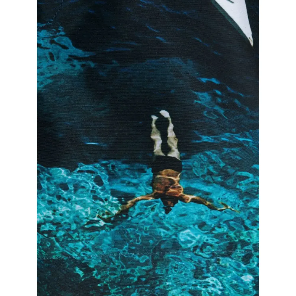 Синий, разноцветный, фотопринт, серебристая фурнитура, выгравированный логотип, бирка с логотипом, потайная застежка на молнии и пуговицах, регулируемые ремешки на поясе, прямой крой, два кармана по бокам и карман на молнии сзади. Пожалуйста, примеряйте купальники и пляжные шорты только поверх собственного белья.