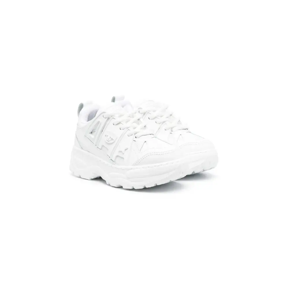 Цвет слоновой кости, телячья кожа, тисненый логотип сбоку, нашивка с логотипом на язычке, шнуровка спереди, петля для подтягивания сзади и массивная резиновая подошва.