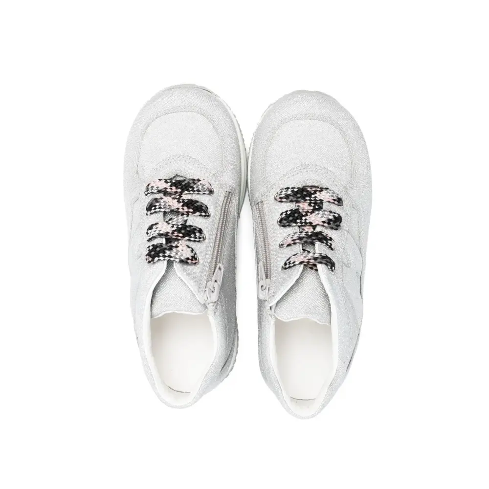 Светло-серый, телячья кожа, вышитый логотип сбоку, плоская резиновая подошва, шнуровка спереди и закругленный носок.