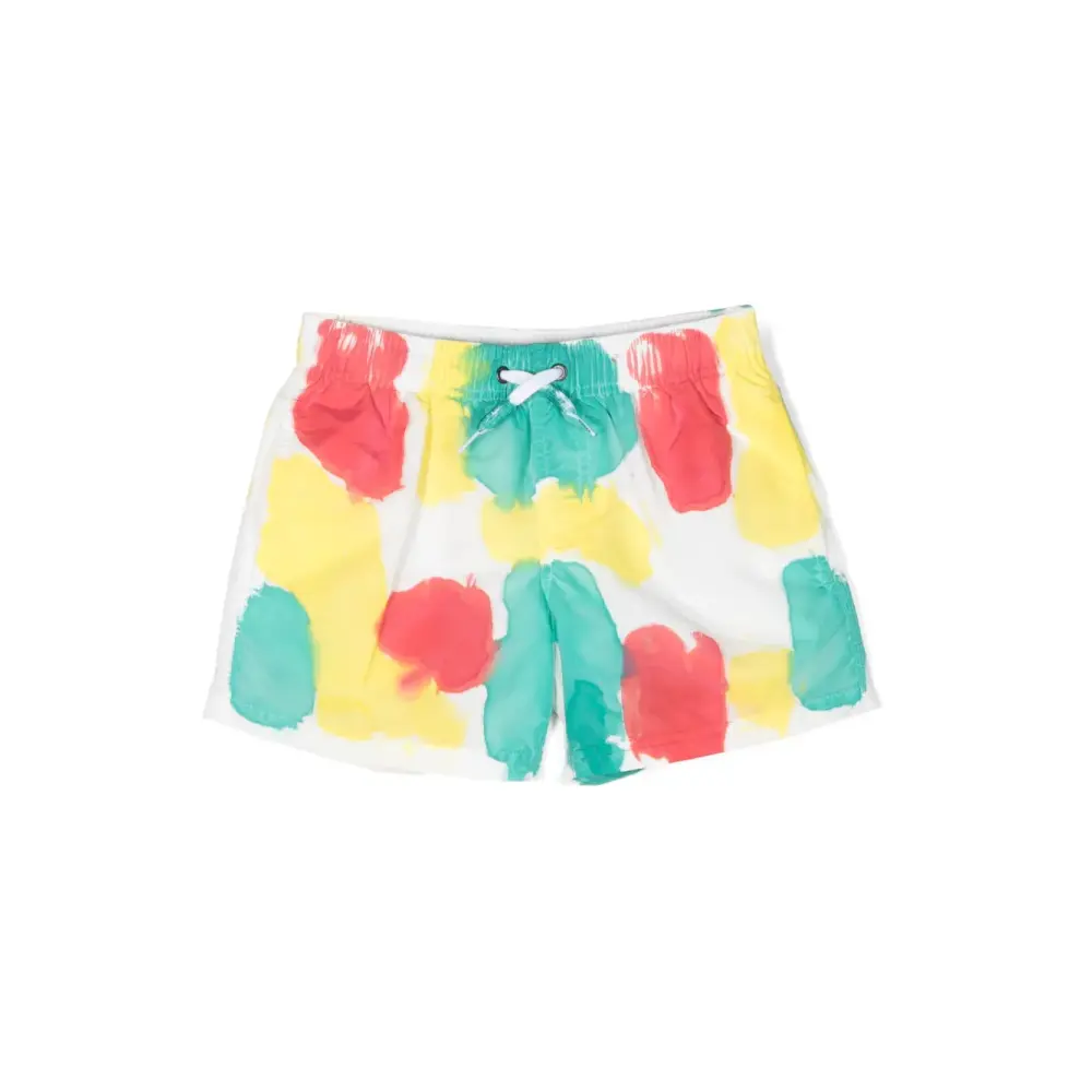 Белый/разноцветный, абстрактный принт, кулиска на талии, два вшитых кармана по бокам и прямой подол. Пожалуйста, примеряйте купальники и пляжные шорты только поверх собственного белья.