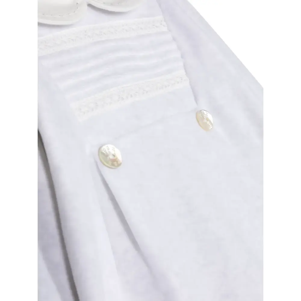 Светло-серый, хлопок, вставки в технике кроше, манишка, застежка на пуговицы сзади, длинные рукава и модель с закрытыми ступнями.