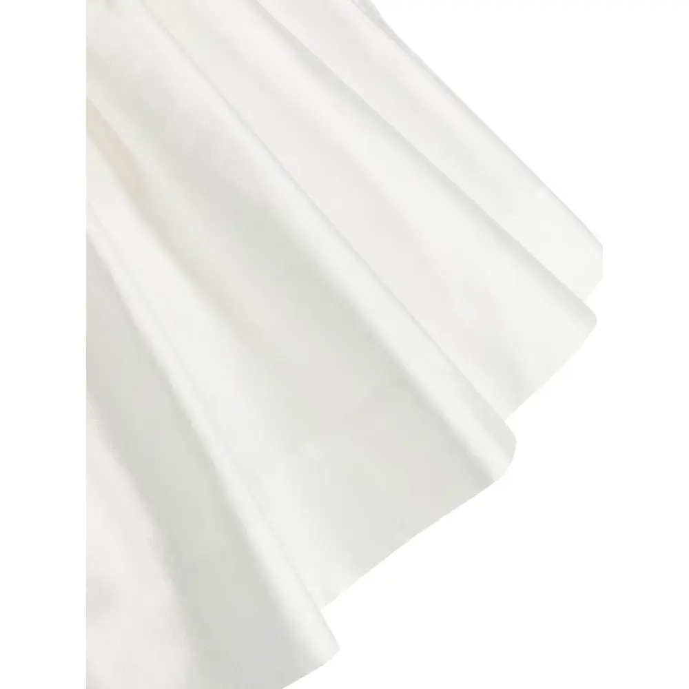 Белый, смесовый хлопок, прошитые края, воротник с оборками, застежка на пуговицы сзади, короткие рукава, застежка на завязке сзади и расклешенная юбка.