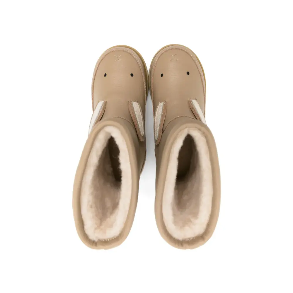 Серо-бежевый, телячья кожа, подкладка из овечьей шерсти, объемная аппликация, петля для подтягивания сзади, тисненый логотип сзади, закругленный носок, модель без застежки, высота по щиколотку, плоская подошва и резиновая подошва.