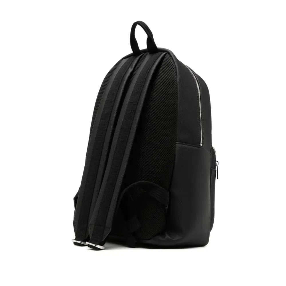 Черный, парусина, ткань пике, тисненый логотип спереди, серебристая фурнитура, круговая молния, две регулируемые бретели, закругленная верхняя ручка, накладной карман на молнии спереди, нашивка с логотипом внутри, внутреннее отделение для ноутбука, внутренние карманы на молнии и цельная подкладка.