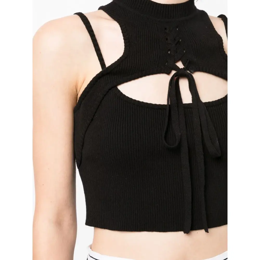 Черный, хлопок, вырезные детали, ткань в мелкий рубчик и укороченная длина.