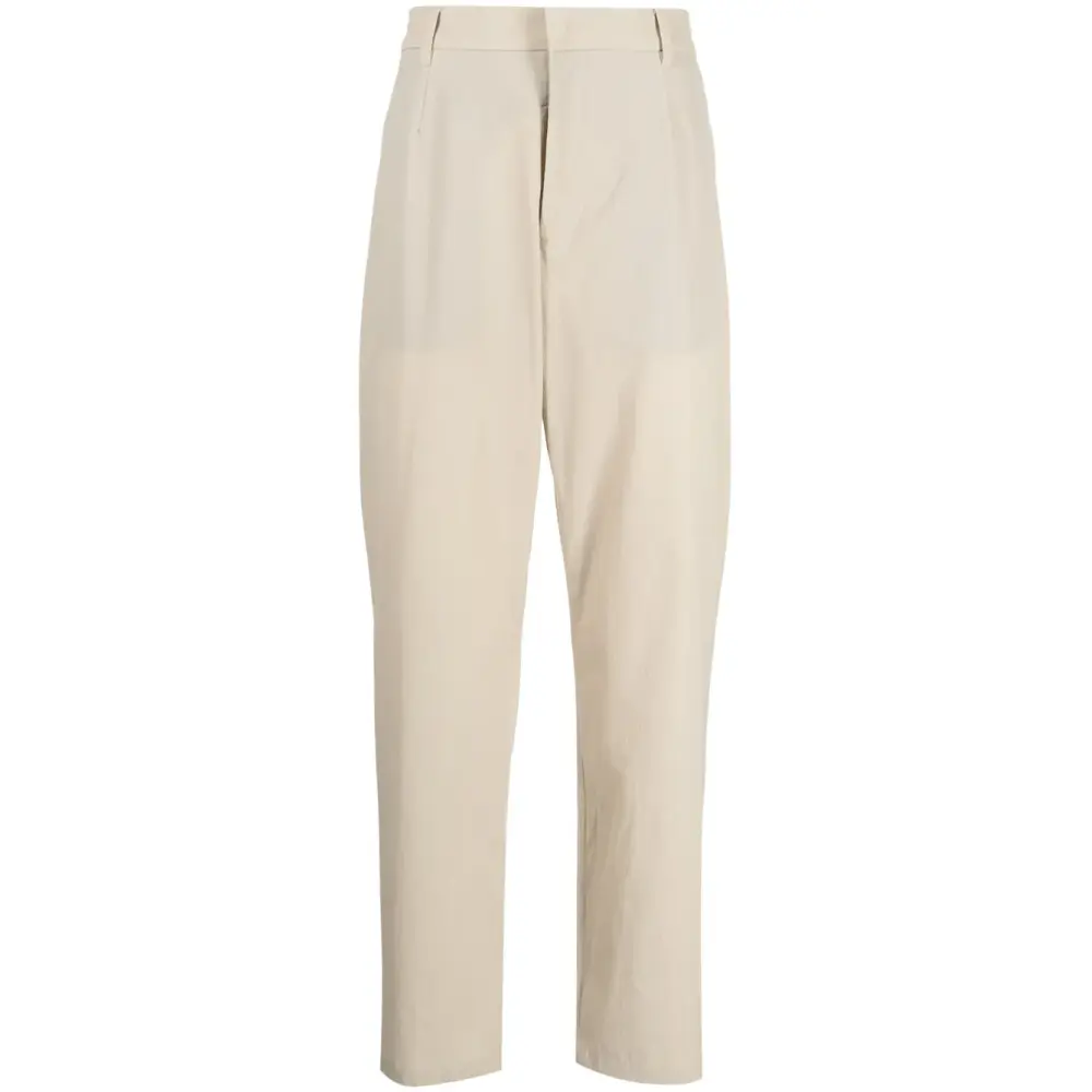Кремово-белый, петли для ремня, кулиска на талии, потайная пуговичная застежка спереди, два кармана с листочкой сзади и прямой крой.