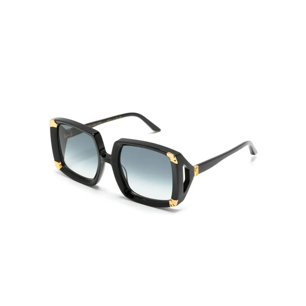 Черный, ацетат, глянцевая фактура, оправа оверсайз, градиентные линзы, линзы с защитой от ультрафиолета, тисненая деталь, заклепки, золотистая фурнитура, прямые дужки и дужки с закругленными концами. В комплект входит защитный чехол для очков.