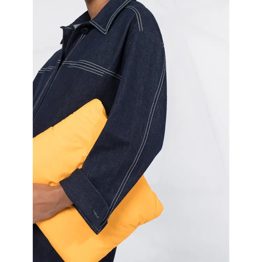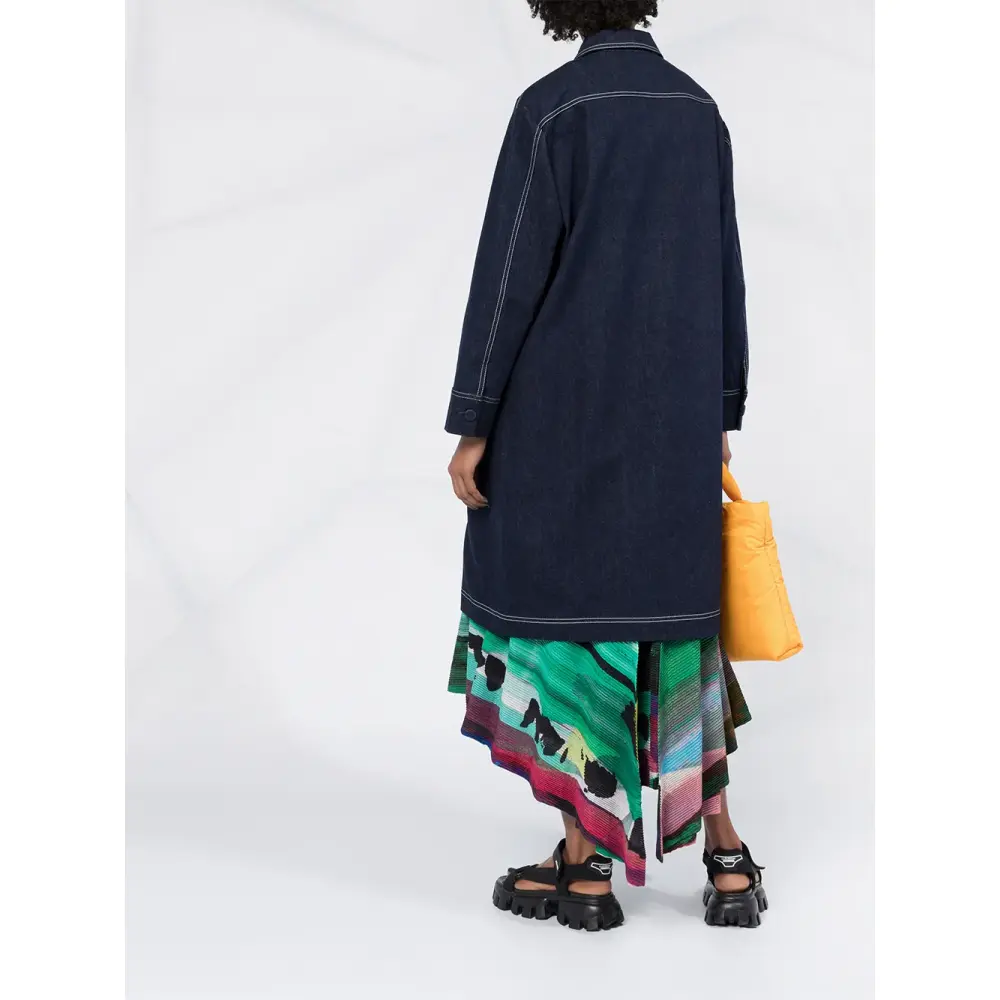 Контрастная строчка, классический воротник, застежка на пуговицах спереди, два прорезных кармана по бокам, длинные рукава, манжеты на пуговицах, средней длины и прямой подол. Цвет: синий.