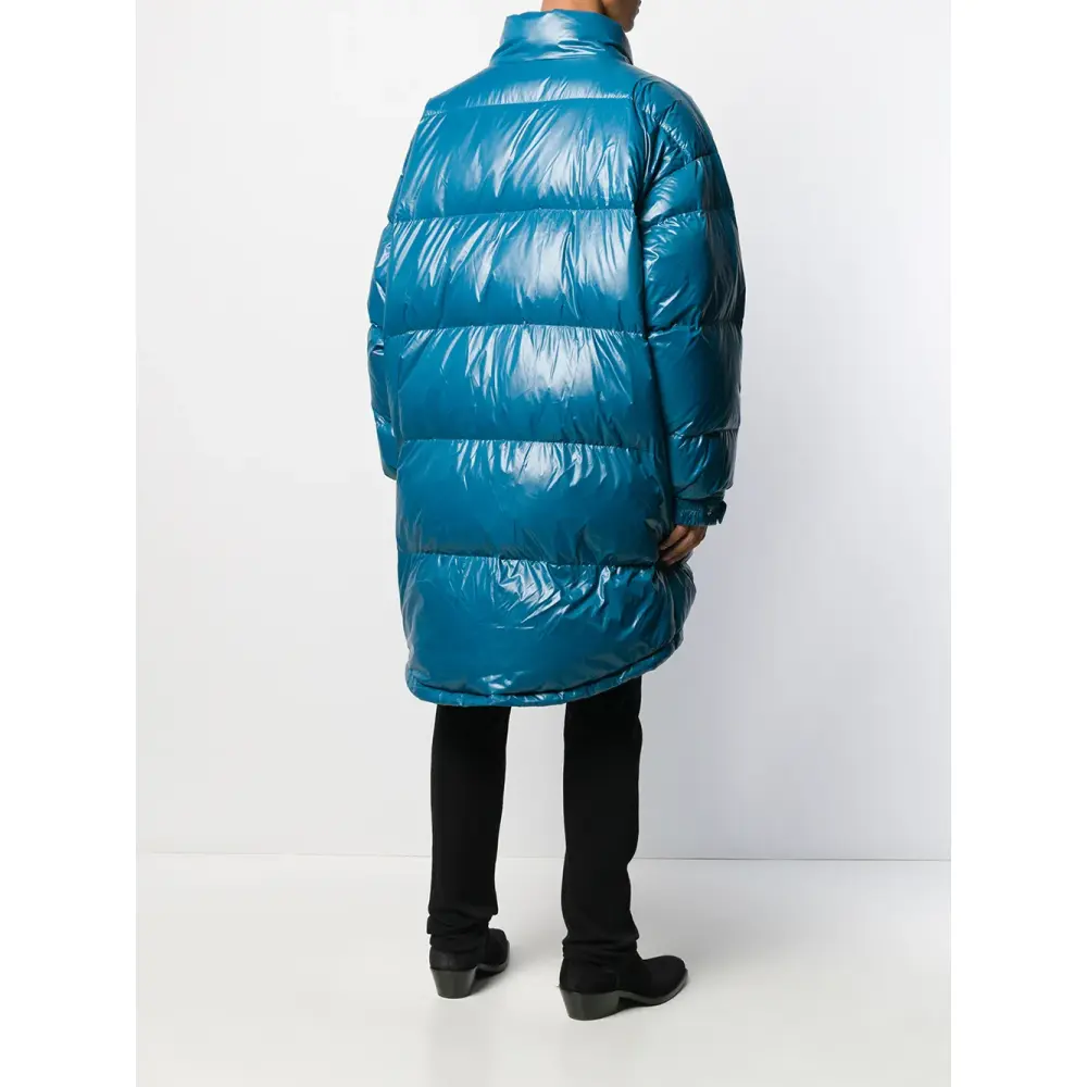 Стеганое пальто-пуховик оверсайз от Paura. Воротник с высокой стойкой, застежка на молнии спереди, длинные рукава, эластичные манжеты, прорезные карманы по бокам, подол на шнурке и средней длины. Цвет: синий.