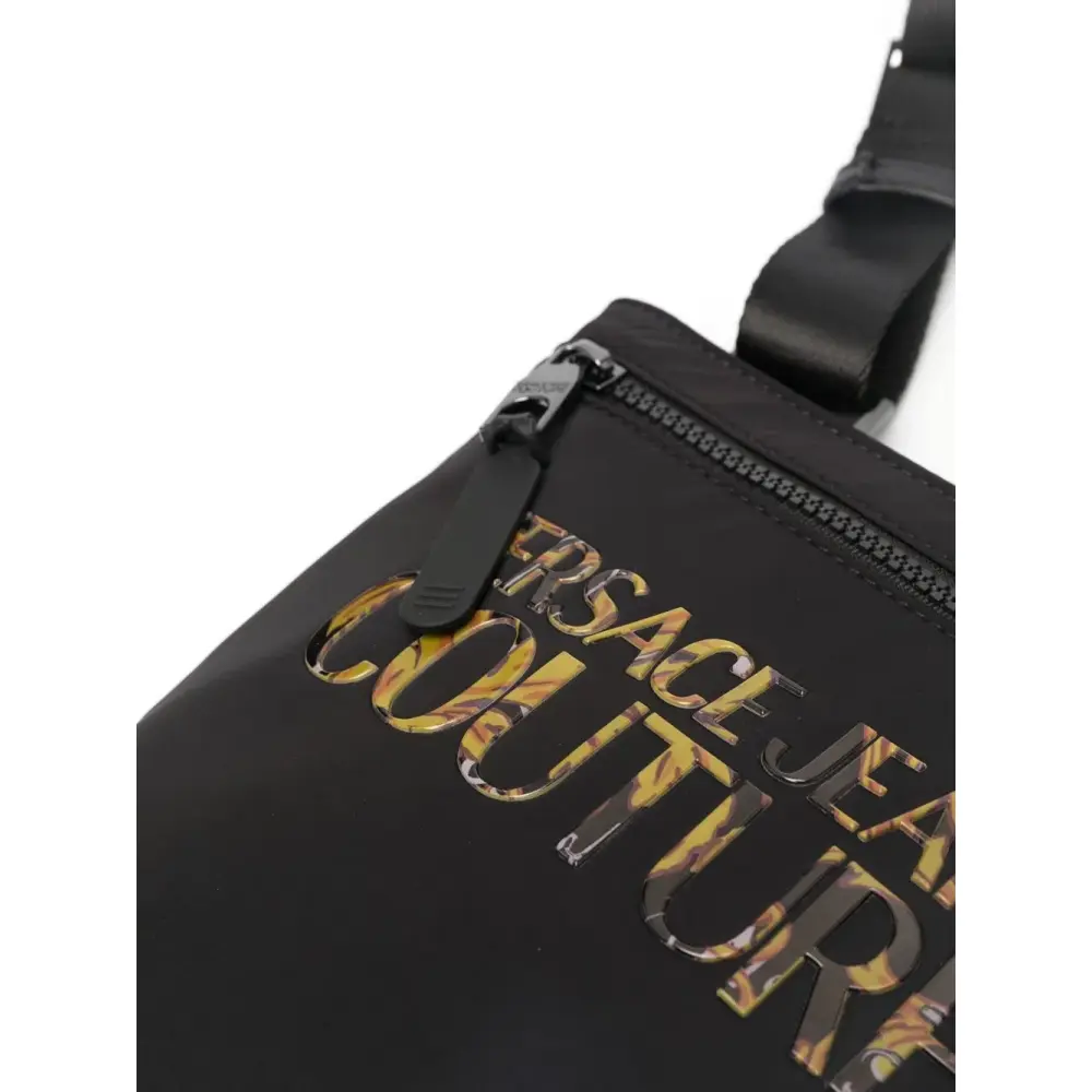 Черный, логотип, застежка на молнии сверху, ремень на плечо и карман на молнии спереди.